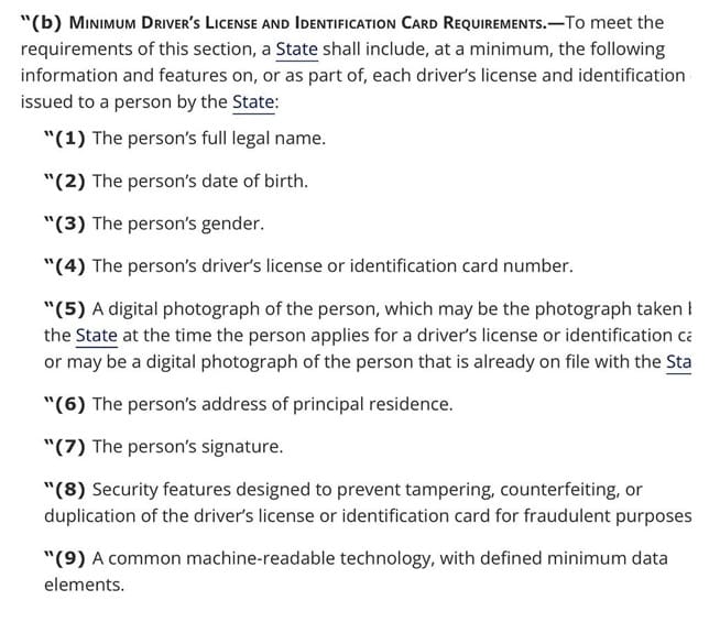 The Act’s Section 202(b) outlines the minimum requirements for an acceptable ID, and it’s packed with digital components that paved the way for today’s mobile driver’s licenses (mDLs). Here’s the breakdown from the relevant text: