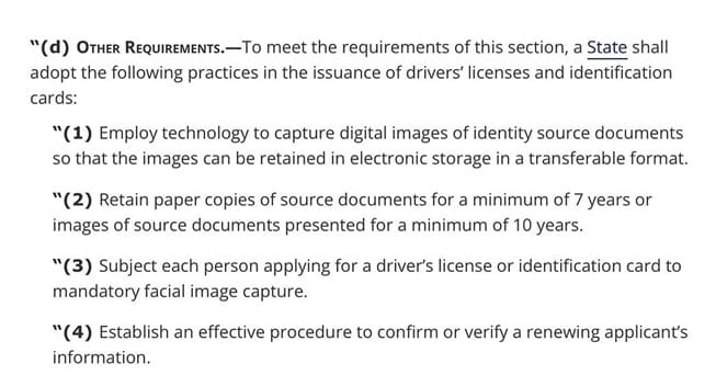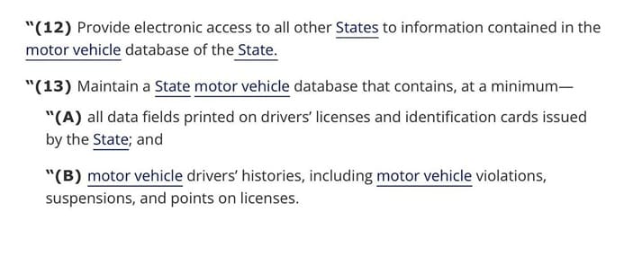 Here’s where it gets worse. The federal law mandating data sharing between states is found in Section 202(d)(12) of the REAL ID Act: “(12) Provide electronic access to all other States to information contained in the motor vehicle database of the State.” The primary purpose is to prevent one person from holding multiple REAL ID-compliant credentials by allowing states to check an applicant’s status nationwide.