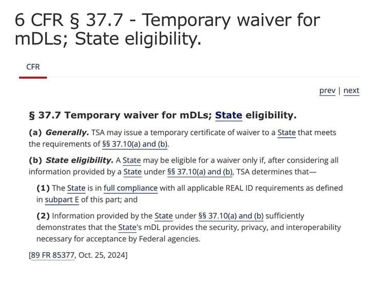 - § 37.7(b) State Eligibility: “A State may be eligible for a waiver only if, after considering all information provided by a State under §§ 37.10(a) and (b), TSA determines that— (1) The State is in full compliance with all applicable REAL ID requirements as defined in subpart E of this part; and (2) Information provided by the State sufficiently demonstrates that the State’s mDL provides the security, privacy, and interoperability necessary for acceptance by Federal agencies.”